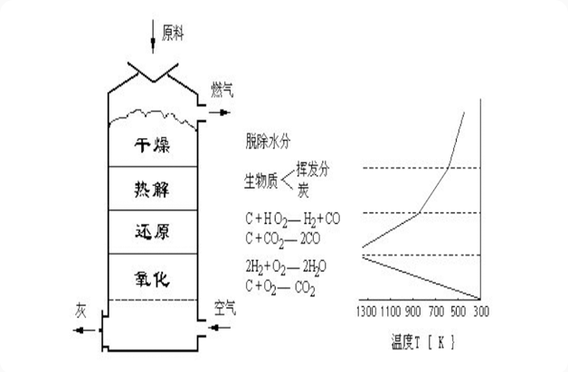 • 流程圖是上吸式氣化爐的工作過程,原料自上而下,氣化過程自下而上。所產燃氣從 下而上,最后經出口將新入爐原料干燥后,自身得以冷卻再從爐內引出進入凈化裝置 從而產生清潔的可燃氣體。